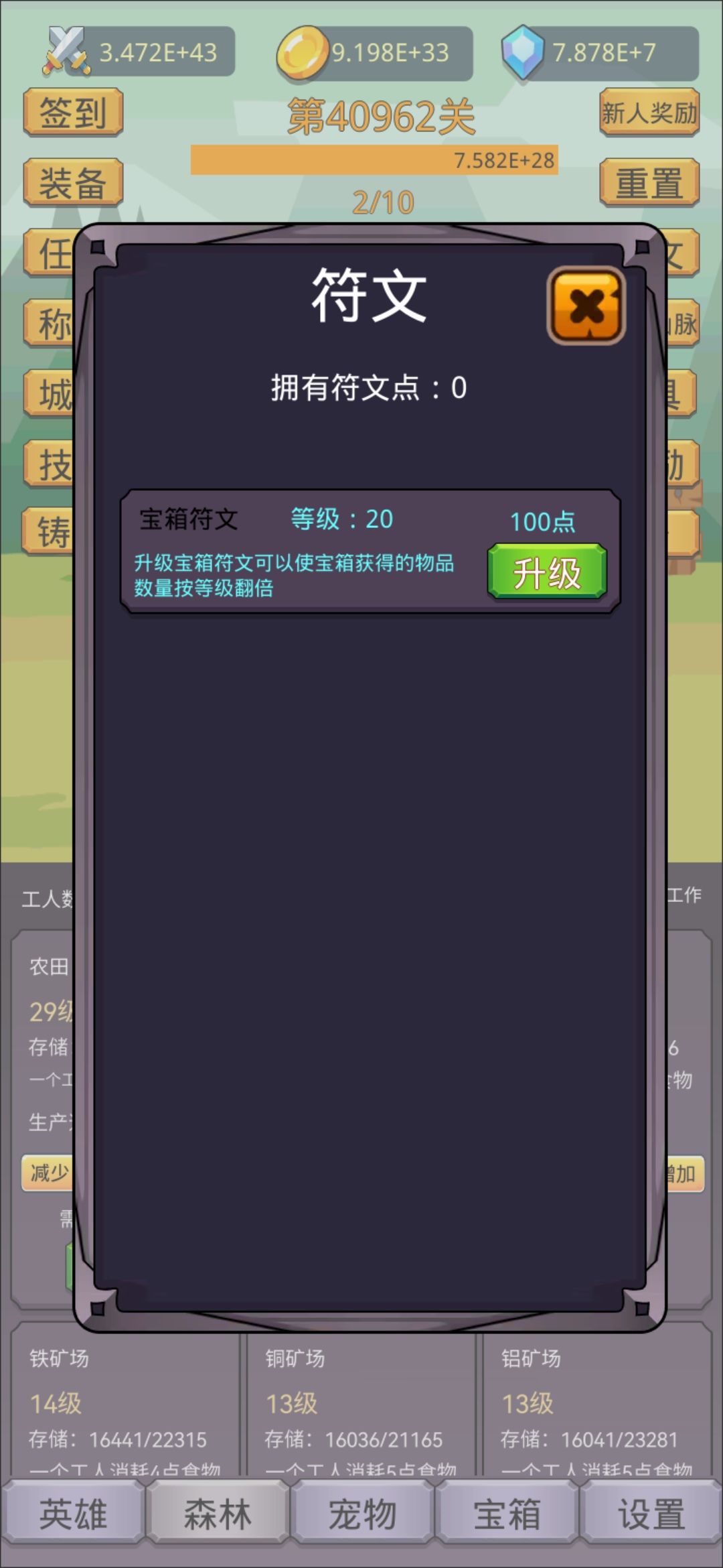 森林玩法:买工人,农田一直拉满,前期什么都不用管,就升农田,然后就是伐木场,要注意的是除了农田的所有材料,生产都会减少食物,所以要保证农田食物不能变成0,不然会自动停止生产,农田升上去了之后,升城堡和风之旅行者的屋子,技能主学连斩术、连斩秘术、连斩时间术,算是个小型跳关技能,还有就是迅捷之风。一般晚上睡觉,只用给农田和伐木场工人,这样早上起来,农田和伐木场满了,就可以放心的用食物去生产其他材料。钻石锻造屋铸造获取的钻石=森林里面的钻石屋生产的钻石×城堡里钻石锻造屋的等级,现在性价比不高,还是优先升农田。