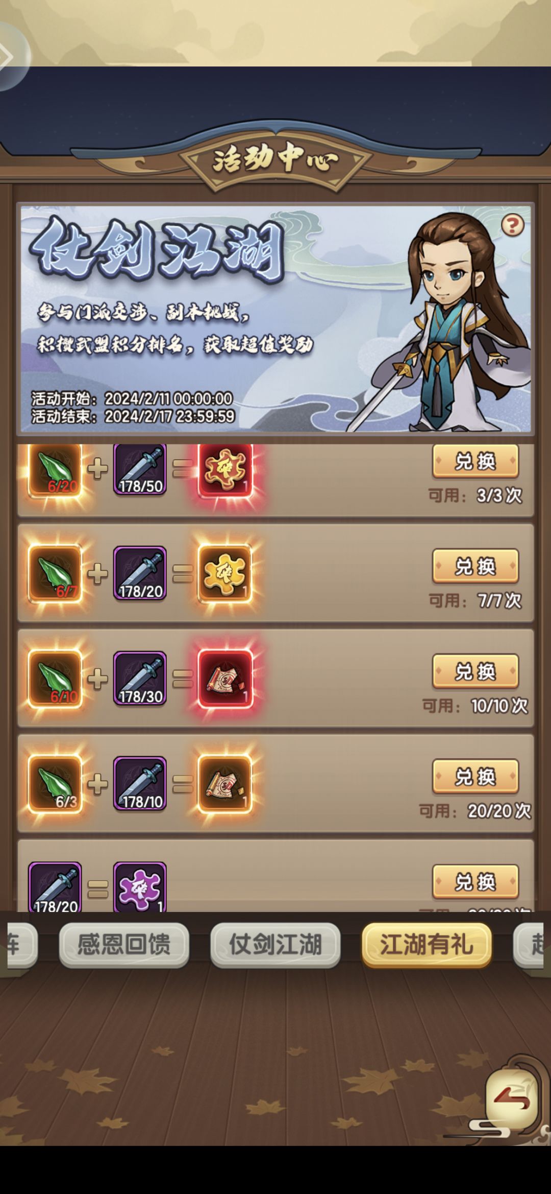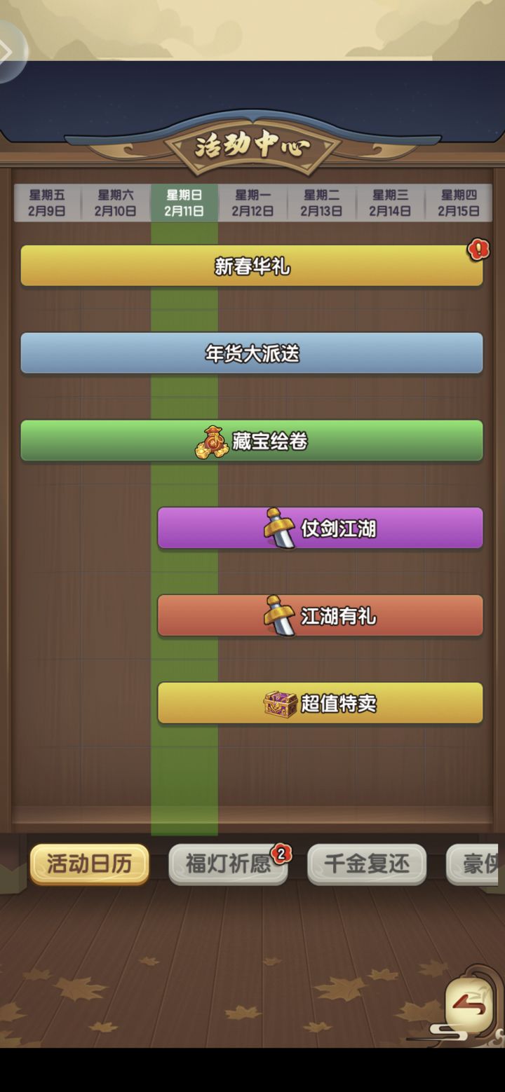 1. 新春华礼:签到活动,满满的诚意,少签一天都是血亏呀,最亮眼的奖励是10个红弟子碎片,10个红客卿碎片,5个红独门2. 赶年兽:爆竹的6元礼包值得入手,其他氪金的咱就算了。金龙币优先兑福灯和天火,然后是兑红色秘宝碎片。元宝买年货,先把弟子和绿武学都买了吧,然后每天必买的是2个2888元宝的春节折扣宝箱(5个红弟子碎片和5个红客卿碎片),在计算下元宝还有多余就买1688元宝的红独门。这次春节活动都能直接白嫖出一个红客卿了,很赞
