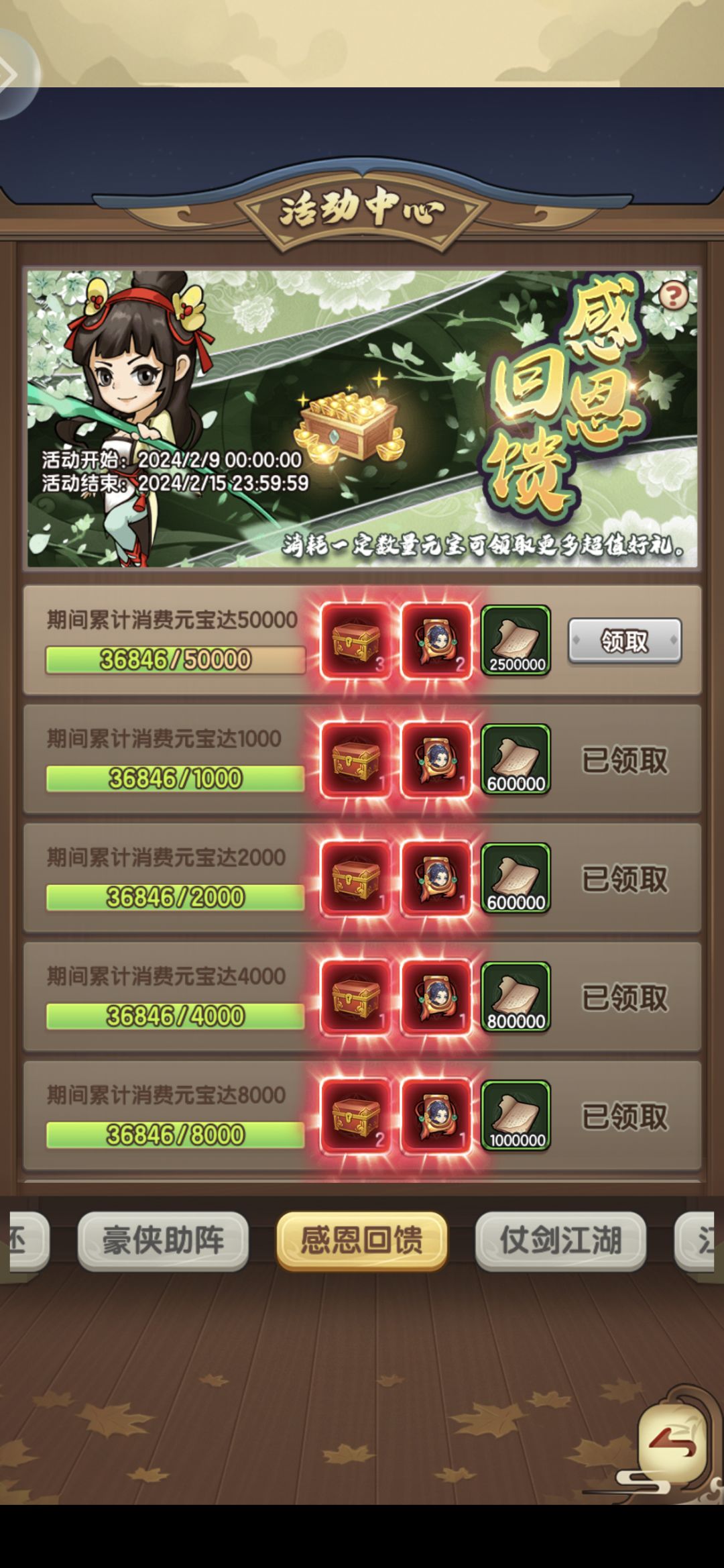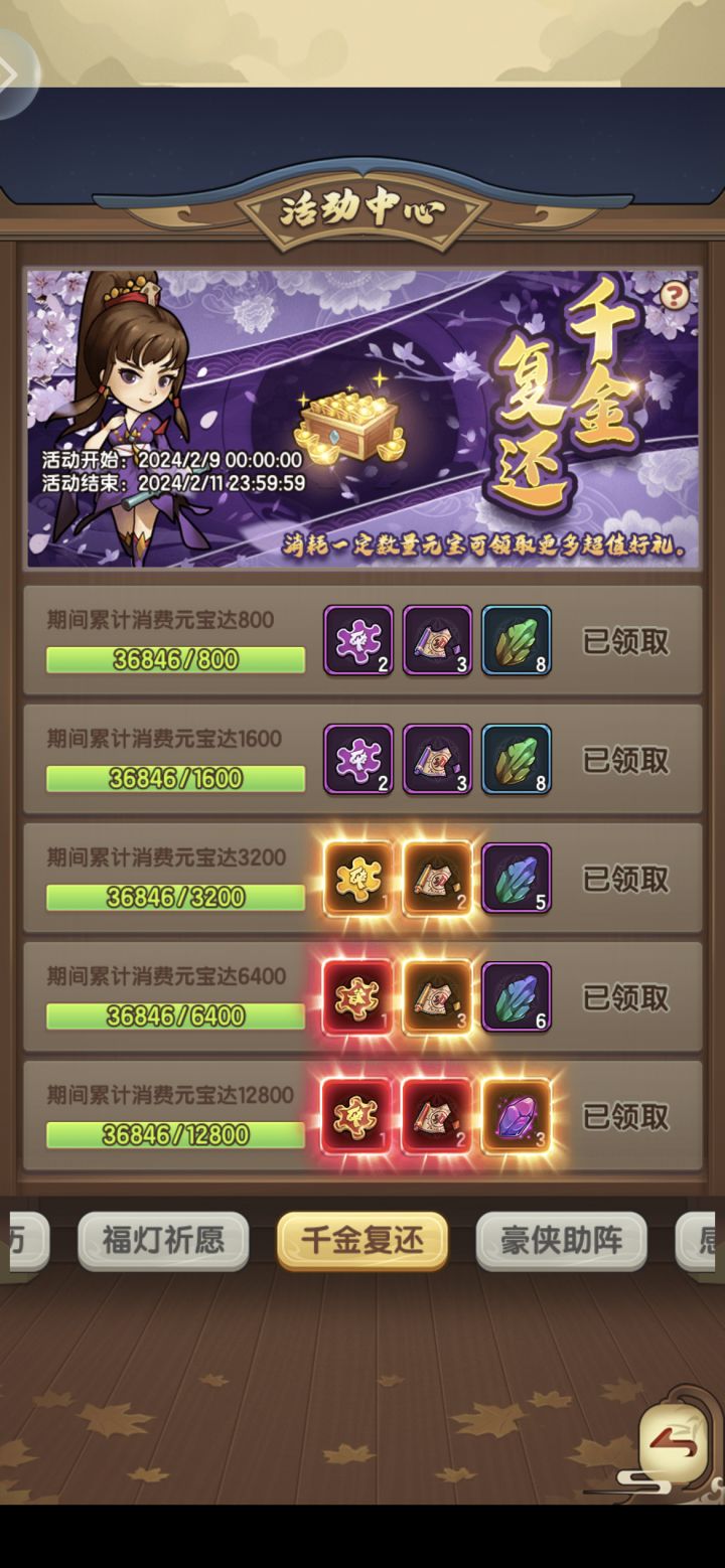 5. 藏宝绘卷:黄弟子能探索6格,紫的4格,蓝的3格,一般跟着做活动,都是能做完的,存白嫖送奖励第三周的就写到这了,谢谢各位掌门观看,求个赞~最后㊗️大家龙年大发,好运连连,健康快乐每一天