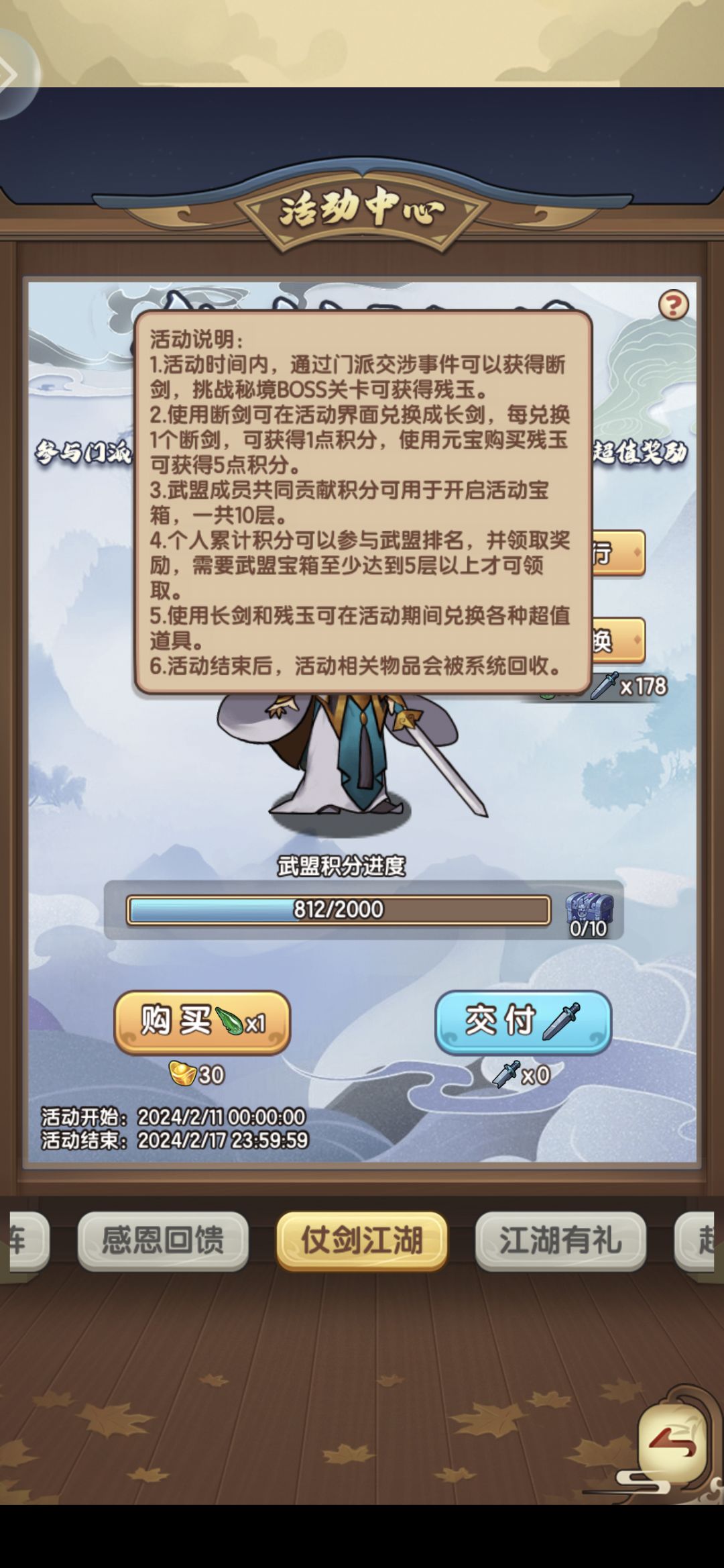 值得注意的是,活动道具断剑,得用掌门令交涉,出现事件了才会给道具(所以有时候自动交涉完没拿到道具或拿到的很少也不要奇怪,可能是因为交涉全是打怪和拿箱子了