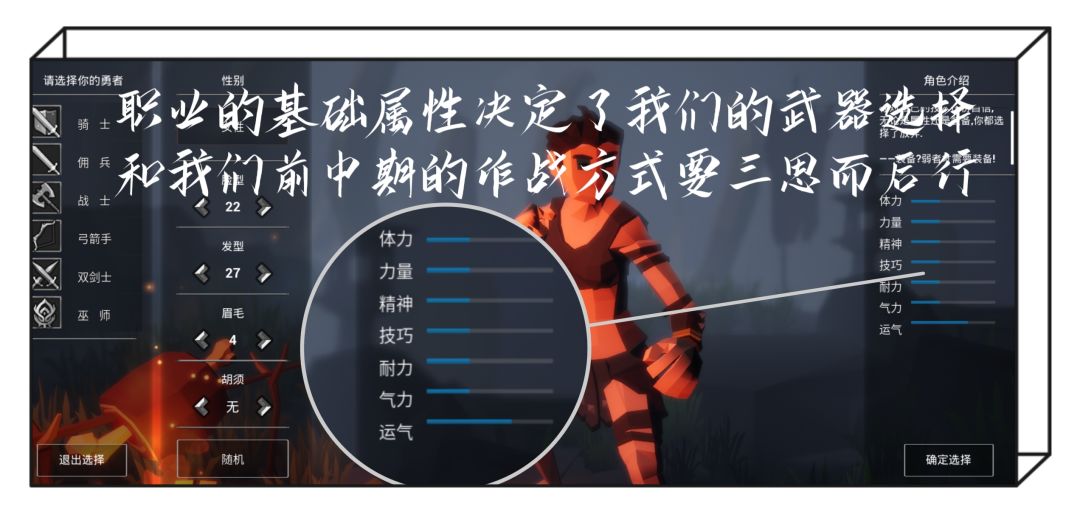 佣兵的属性加点就没有太多技巧可言了只有按照传统的{体、力、气}合理分配就够了,如果常规的话加技巧解锁长弓也就是把部分体和力适当匀给技巧就够了,只要不影响气保持体力能够稳定通关其余都不重要,更多还是对玩家技术的练度要高但也没有高到夸张的程度,会躲避攻击和分配好气力的使用问题就不大了,但就是缓慢的攻击频率任然令人堪忧。