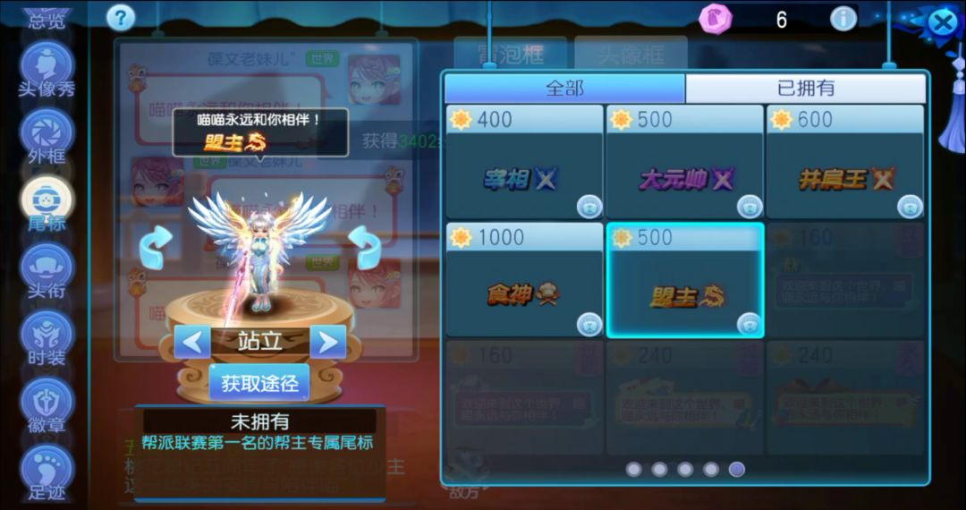 还有一个重要的颜值获取方式,那就是帮战!轻松解锁超多颜值!大家都知道帮派联赛,排名前三的各位帮主是有特殊的尾标,第一名🥇的帮派帮主还有特殊坐骑拿!虽然说,这些奖励都是有时效的,但是对于我们来说,只要能够拿到一次就能够把颜值解锁了。