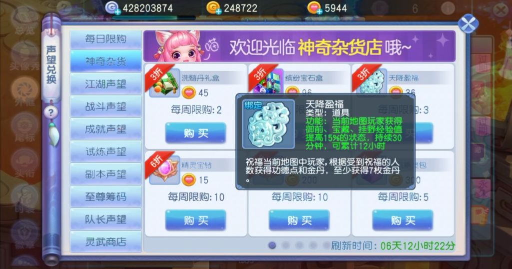 我们只需要每周在神奇杂货中购买天降盈福,打折购买价格非常的低,然后在排行中查看功德,确认自己能够成功拿到头衔然后开始吃天降,很多人说三个不够,那我们就多积攒几周啊!