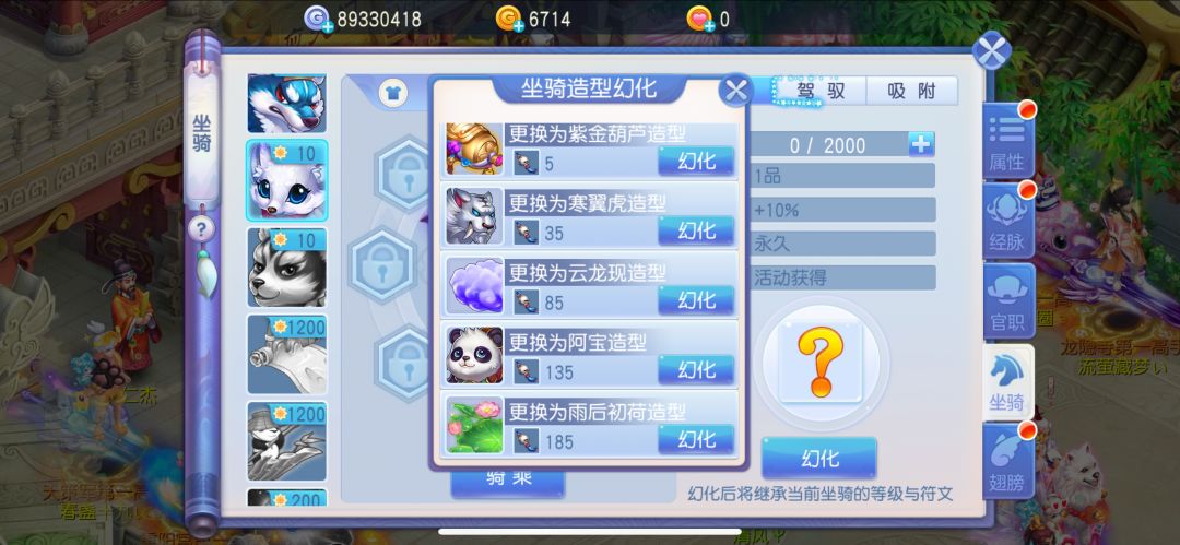 开局一只狗,幻化逐步走,我们可以看到已经从狗幻化成狐狸,下一步就是狐狸幻化为葫芦,一步一步的逐渐更换到荷花,花小钱办大事,轻松拿下所有普通坐骑的颜值!当然土豪这一条就不用看了,直接一次性全部购买就完事了。