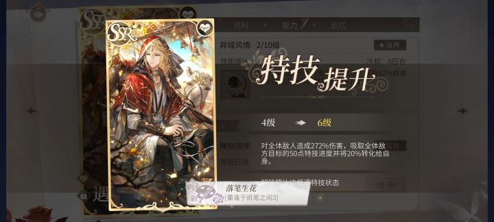 ,以前养卡真的很随便,拉到满级就上场,小技能随心情升,特技升级是舍不得用的(那个我带着墨镜的道具攒着一大排真的很爽)。还挺神奇的,我打其他的游戏都是偏强度党,只有玩绘旅人是完全的xp党。好期待采风什么时候来,感觉我现在高难本已经变强了,嘿嘿,黑街打不了,打打采风爽一下![[表情_大笑]](https://img-tc.tapimg.com/market/images/926e61cb56225243b1486de286dec918.png)