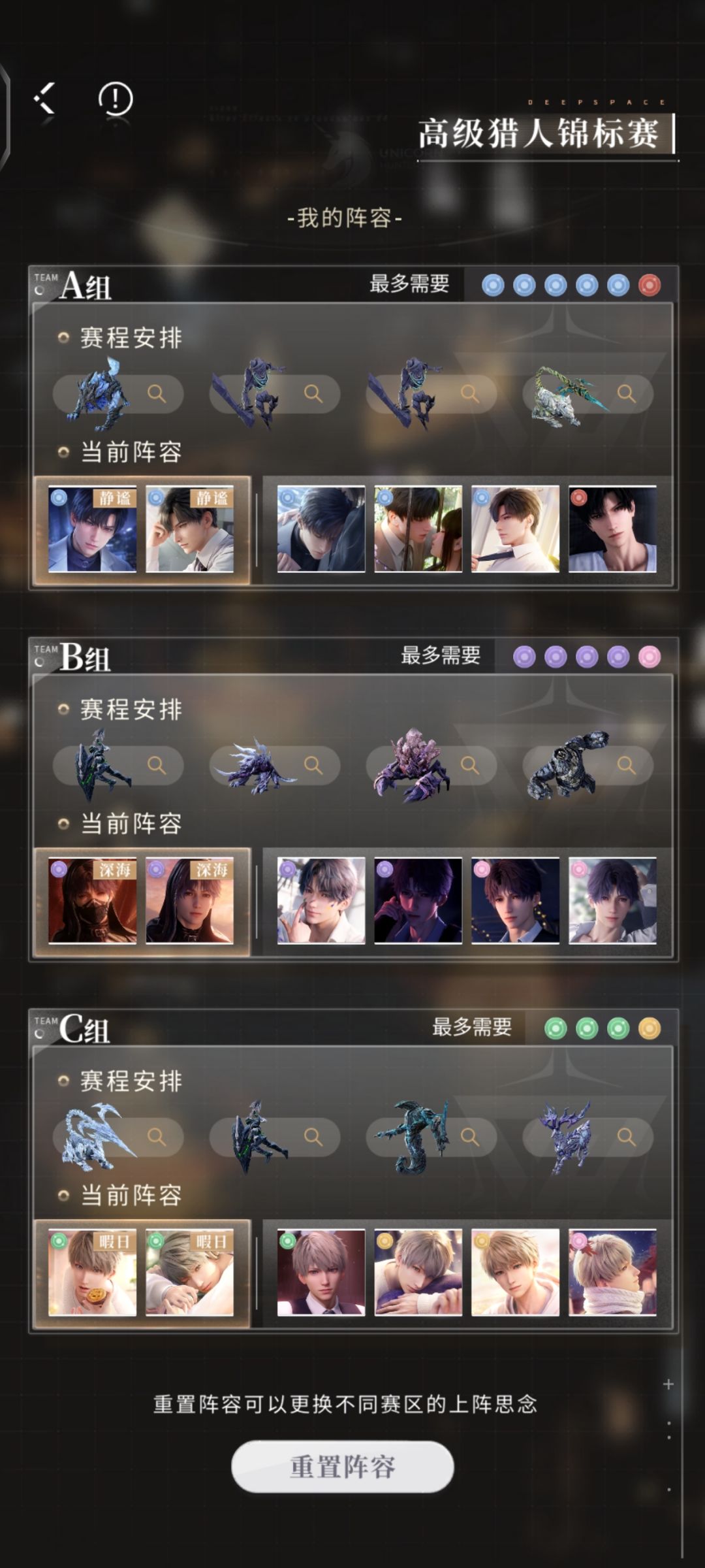 高级锦标赛卡在15星,开放轨道卡在50关,差下半的boss半条血。如图是锦标赛我的面板。