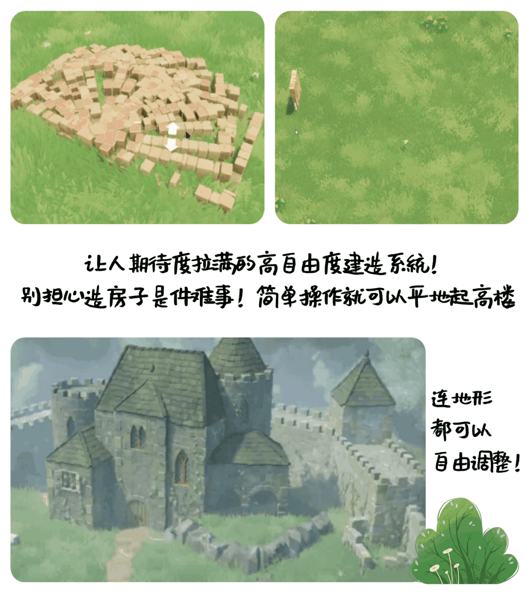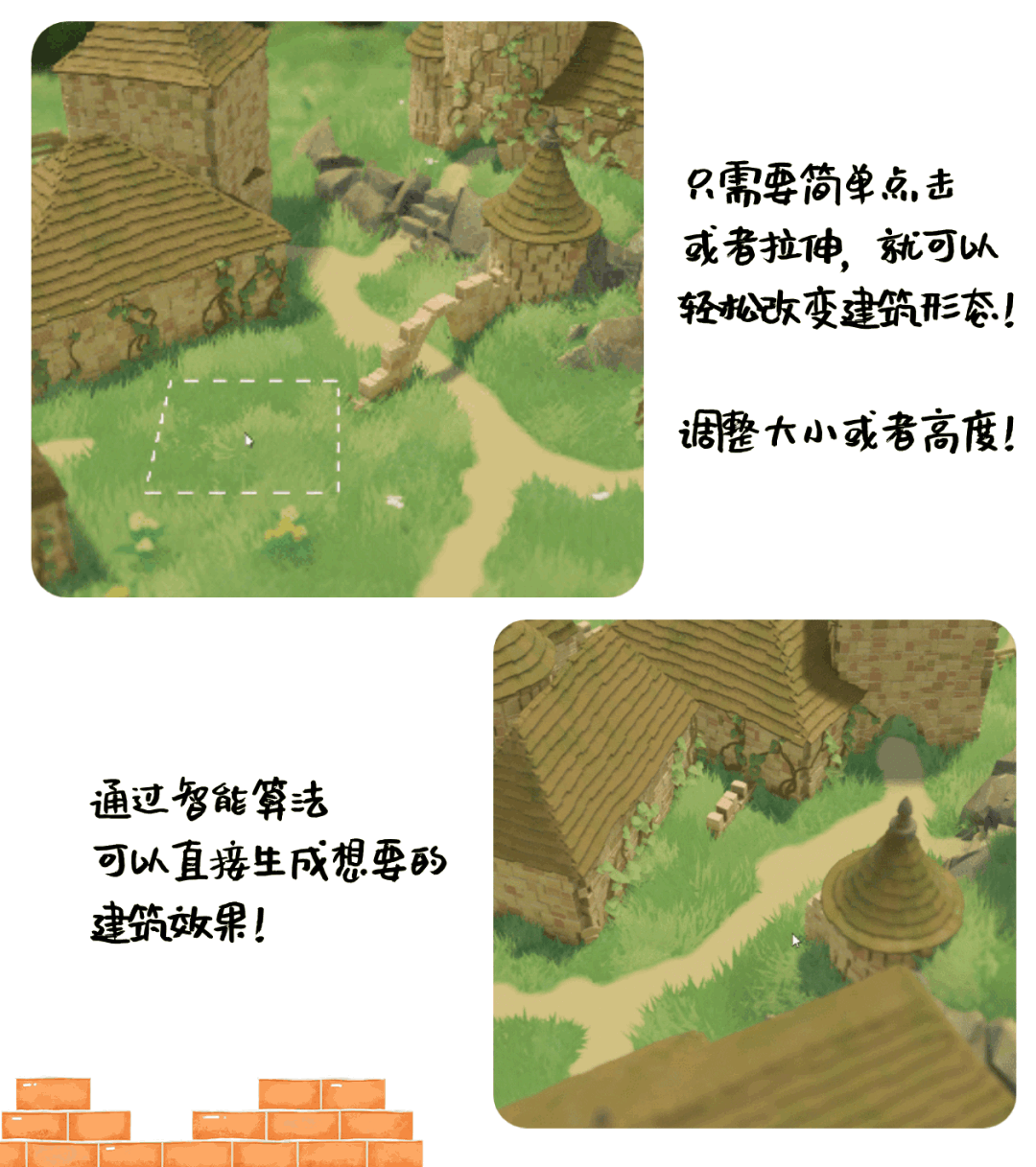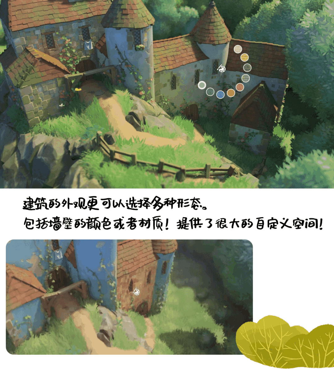 不仅如此,游戏也大幅降低了自定义建筑设计的难度,各种看似复杂的建筑步骤仅需玩家简单操作就可以实现,比如高墙建造完毕,可以自由拉伸调整整体的高度,比如你也不用担心自己画的塔顶不够圆,游戏会对你绘制出的形状进行智能修正!建房子,从未如此丝滑顺利!不用钻研成为技术流,完全沉浸在这种放松而平静的体验中吧。