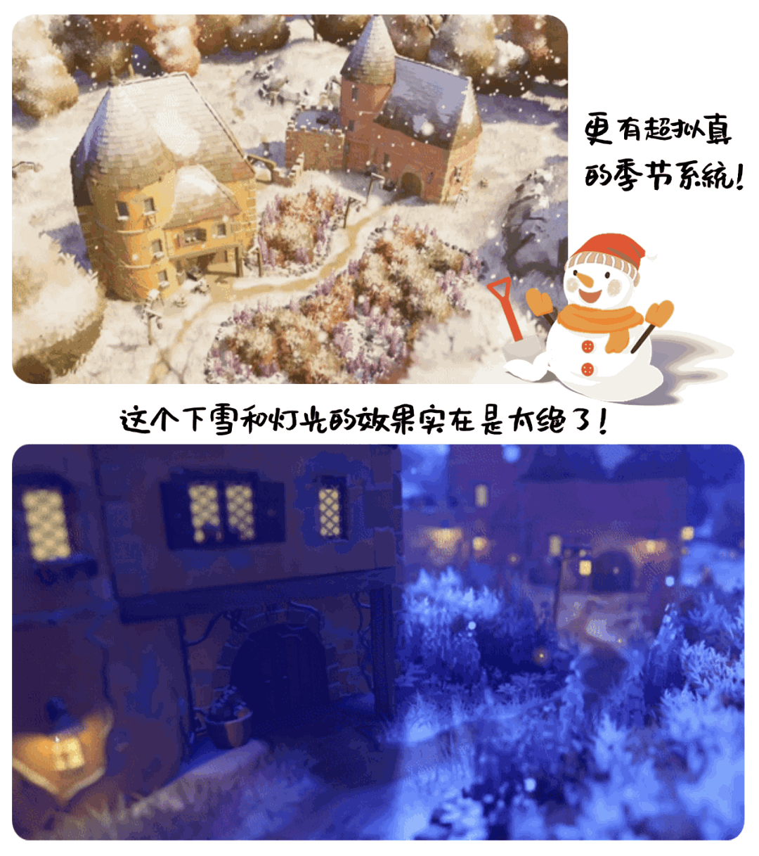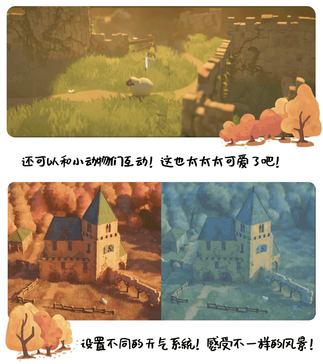 当然,游戏还有很多非常可爱的互动小设计,包括你可以抚摸小动物,还可以设置不同的季节/时间,体验各有特色的场景!