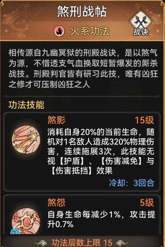 PVP中的输出功法推荐为:煞刑战帖和烈阳,门槛较高,平民玩家还是走坦克路线较好。