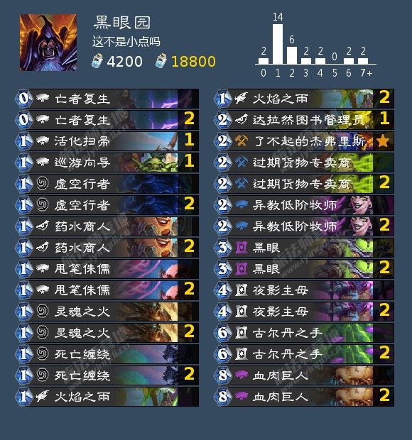 来自这不是小点吗的黑眼园,他在上个月用这套以32场78胜率打到结算500左右,比起传统的黑眼园,这套更加注重血肉巨人的减费和黑眼的效率,力争在4-5费超展开压制住对手。火焰之雨在面对T7猎和盗贼的1血潜行生物的时候表现十分优秀,也是良好的自残手段。动物园缺乏补刀,死亡缠绕能够补刀过牌,甚至可以补自己的11腾格子+过牌,同时也是能回收甩笔侏儒的手段,同时携带了达拉然图书管理员来应对牧师的倦怠光波和法师的冰系法术以起到更低费实用面更广的活化龙息的作用,携带姐夫也一定程度上填补了卡组过牌快但厚度低的不足。