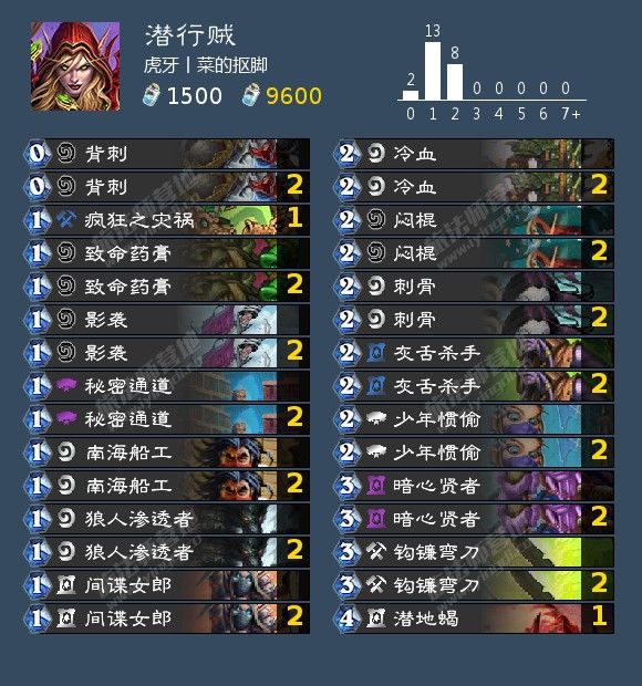 来自虎牙丨菜的抠脚的潜行贼。整套牌最大的亮点在于疯狂之灾祸,所有生物除了暗心贤者是3血以外,全是2费及以下的,剧毒刀的副作用几乎没有,直伤效率而言1费打4也相当不错,还能过墙处理大生物起到套牌里第三张“闷棍”的作用。这套牌满编冷血影袭和所有213以外的1-2费潜行,直伤效率相当恐怖,3把刀和秘密通道的加持下,南海船工也合理地进入了构筑。这套牌也相当廉价,只有暗心贤者和秘密通道是紫卡,其他全是白蓝卡,即便手头奥术之尘拮据的玩家也可以尝试。