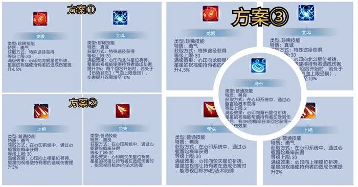 由于游戏前期心印强化次数的限制,所有小伙伴的心印技能等级普遍不高,这种情况下,就可以考虑佩戴技能海石做一下过度: