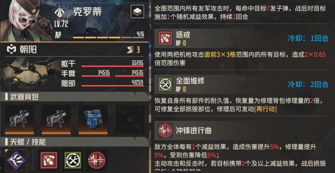 被动效果:针对自身生效,与天赋形成联动,视敌方全体减益效果数量,获得造成伤害提升、受到伤害降低,修理量提升等效果;同时攻击和反击时如果目标携带2个及以上减益效果,还会直接破坏目标1个部位。