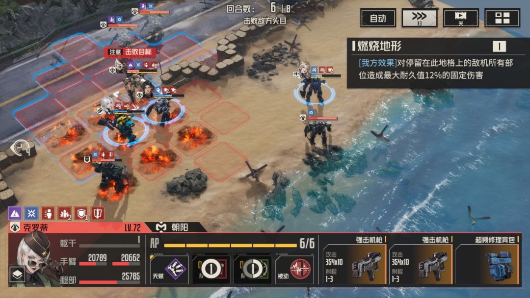 boss单体作战能力不强,关键是在其天赋效果加持下,场上的其他敌人都能叠加减益效果,而这些减益效果,又会进一步强化boss,给我们造成不小的麻烦。尤其是场上两个机关炮,火力范围基本覆盖下方区域,且能够发动协力攻击,没有次数限制,基本上被其一轮攻击下来,我方全体都会携带大量减益效果,随后boss攻击直接就能将我方部位破坏甚至消灭。