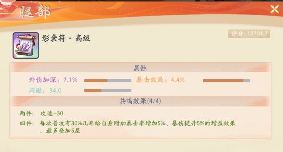 影袭--两件套:攻速+30。四件套:每次普攻有30%几率给自身附加暴击率增加5%、暴伤提升5%的增益效果。