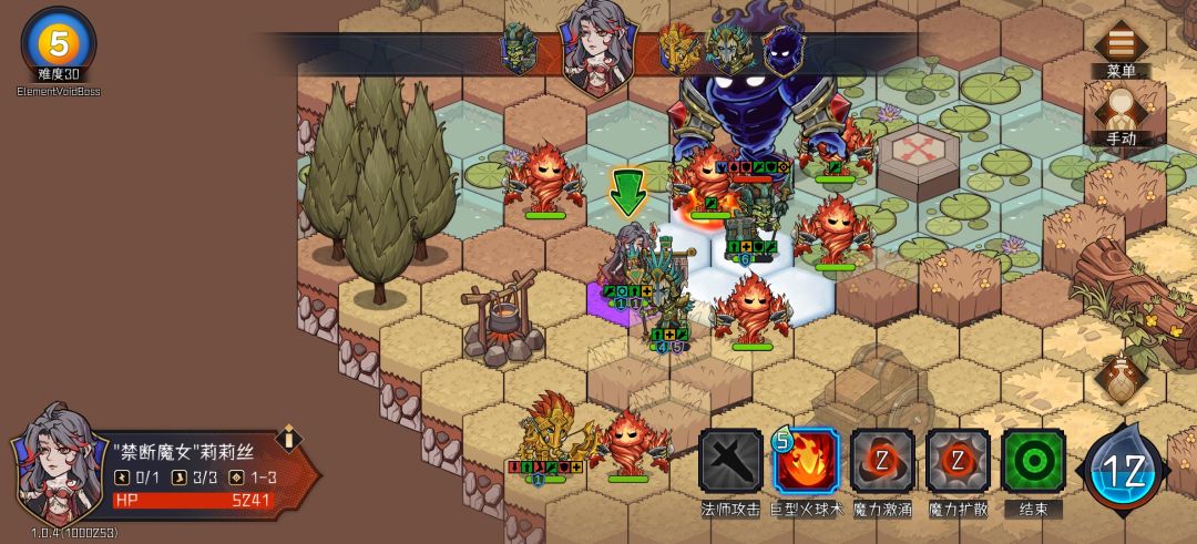 打了一会他可能会往左走一步,然后打右边的,这时候不要慌张,从下面补一个过去就行,排队过去一个一个给他打。一回合会有一两个,他一回合只会打死一个打不完的。然后一会他又回来接着打下面,火元素的位置不能变,三个点位站好就行。