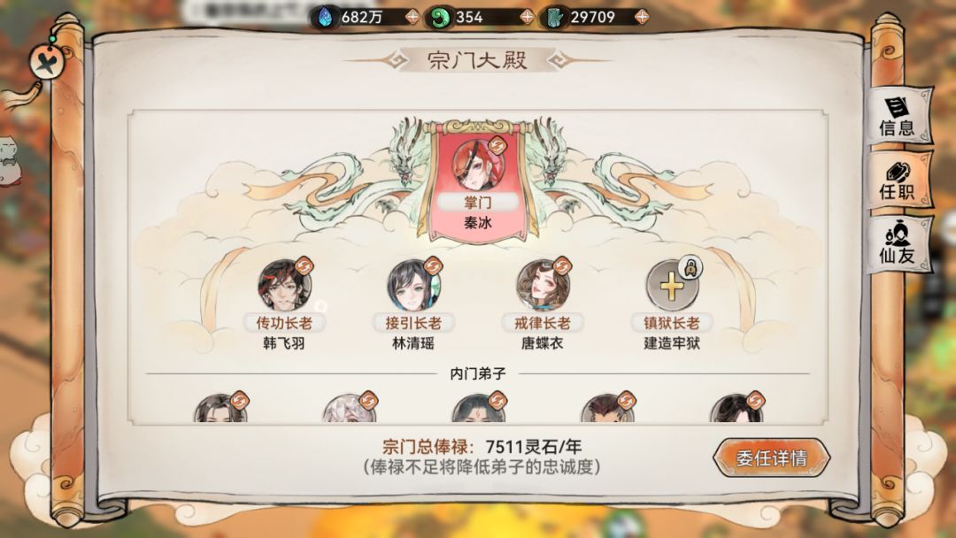 在任职栏目可以给弟子任命职位,掌门+五维,平时可以给主力弟子+战力