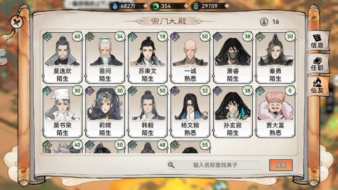 本游戏核心玩法即为招收弟子,提升宗门等级,提升弟子等级。开拓主线。