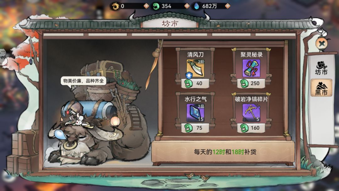 坊市分为坊市和黑市,坊市需要手动刷新才会更新商品,刷新次数一小时增加一次。