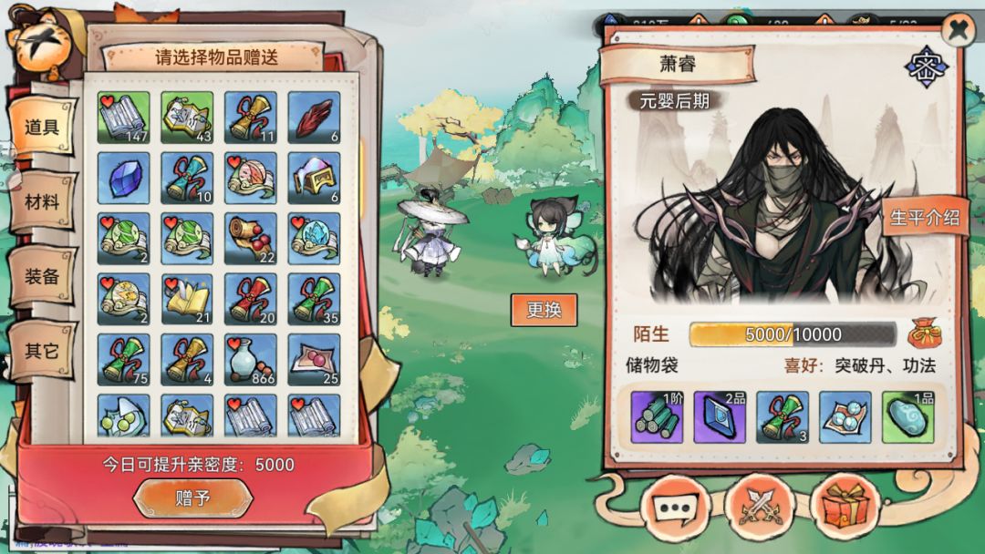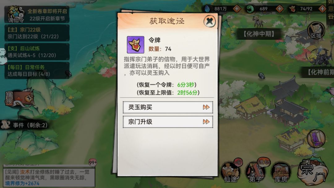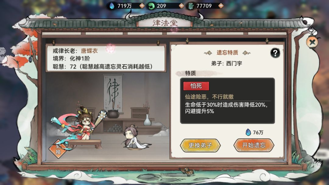 升级可选择不同时间的悟道方式,时间越长弟子入魔的概率越高,同时获得的奖励也越丰富