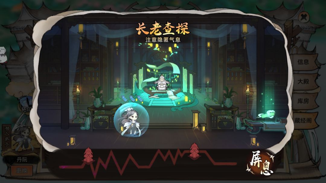 在小人处点击屏息按钮。停止查探走到功法处即为成功。