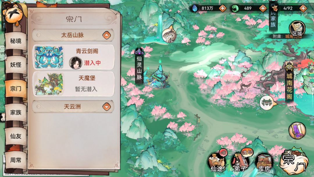 解锁地图会发掘各种宗门,宗门目前的玩法只有潜入弟子,拓印功法。