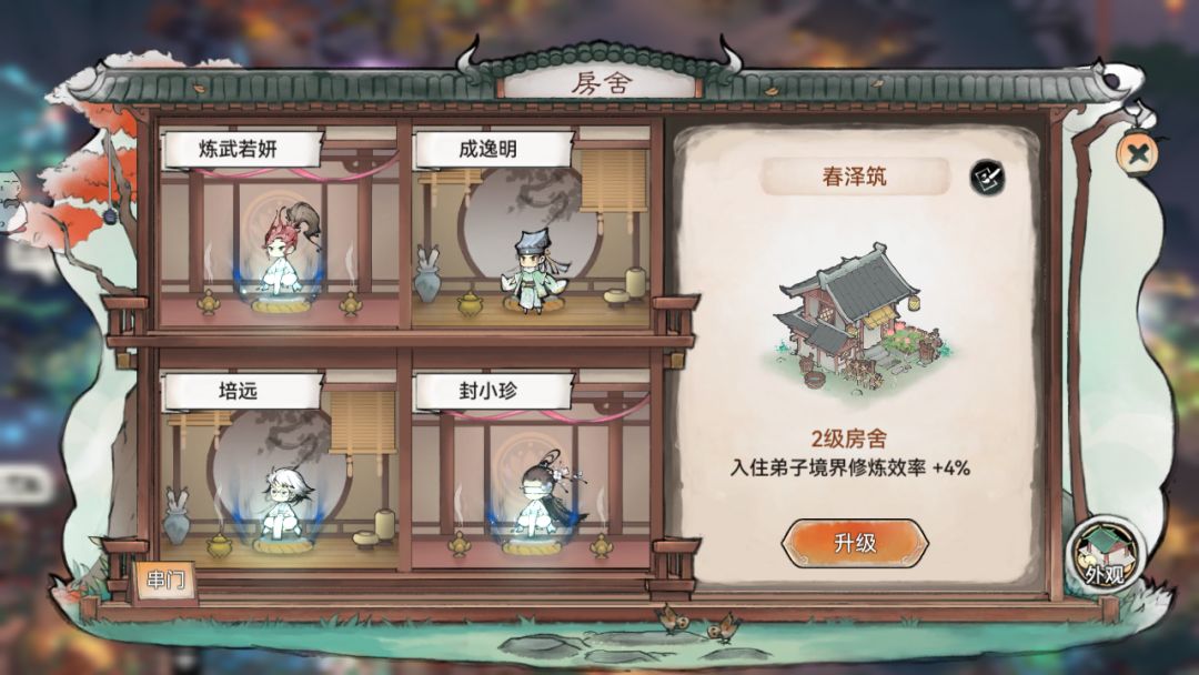 弟子住宿的地方,可以升级,升级增加弟子修炼效率。