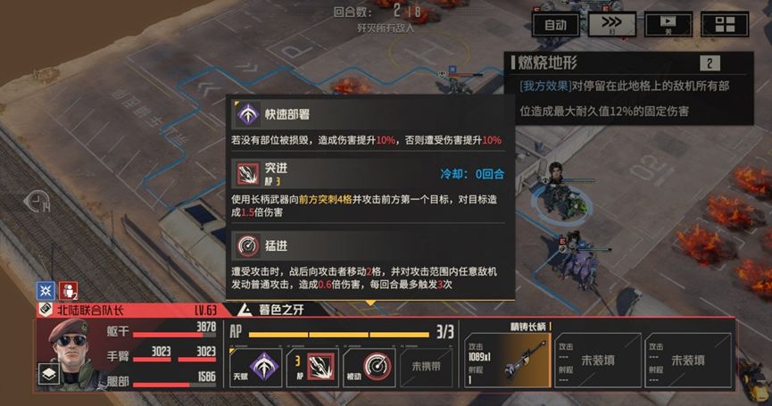 本关难点:本关buff使得敌人伤害比较高,其攻击附带30%最大耐久值的固定伤害。而且这个伤害不需要依靠武器,即使是空手也能造成伤害。即使我们将敌人武器破坏,也要注意拉开距离,不要被敌人摸到。头目需要稍微注意一下,在受击后,会向攻击者移动2格,拉近距离。