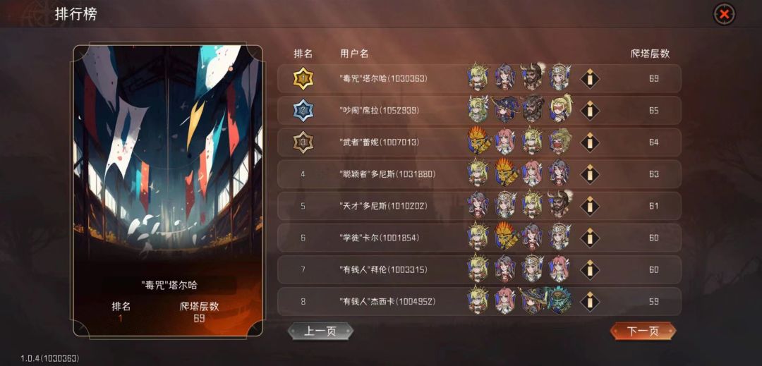 硬要爬还能上几层,但是极限了,输出不够,主C火法没刷到好的武器,最重要的武器都没强化,69难已经磨了18回合了,抗是能抗的住,遗物刷加治疗的,光骑一口奶1.3w,能奶2个,冰骑7000+,也能奶2个