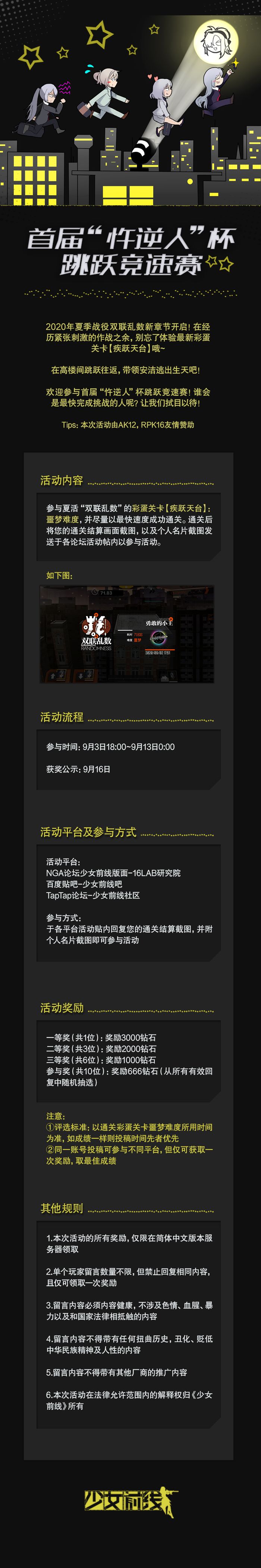 亲爱的指挥官,2020年夏季战役“双联乱数”下篇现已开启!经历紧张刺激的作战之余,别忘了体验最新彩蛋关卡【疾跃天台】哦!社区活动首届“忤逆人”跳跃竞速赛现已开始,活动详情请看下图!