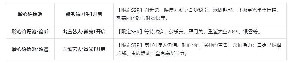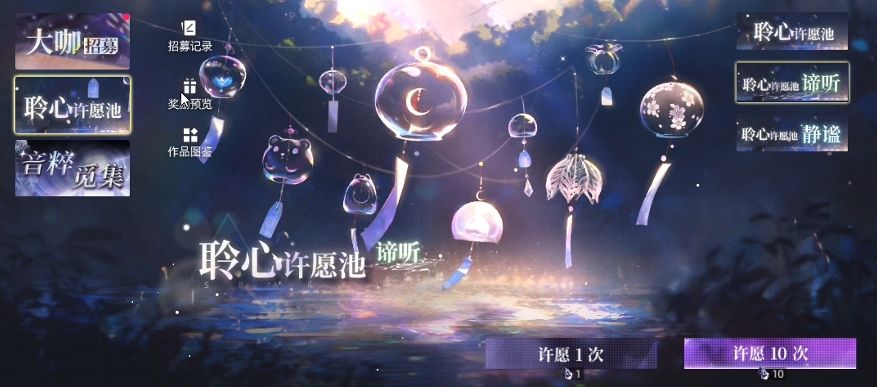 聆心许愿池将划分为【聆心许愿池】【聆心许愿池·谛听】【聆心许愿池·静谧】,均使用【许愿石】进行许愿,共享保底数。