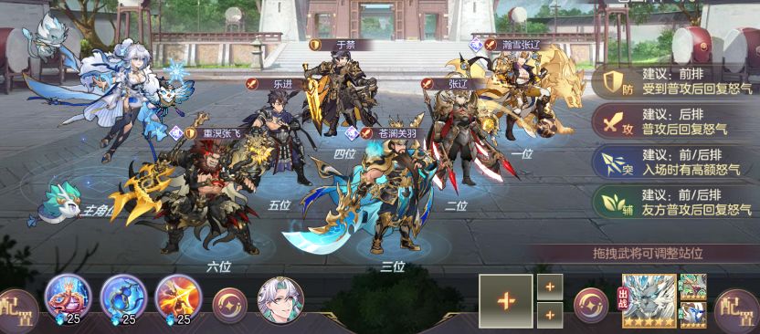 武将:瀚雪张辽(吕布护法)、重溟张飞(关羽护法)/凛煜刘备(赵云护法)、苍澜关羽(关平护法)、于禁、乐进、张辽