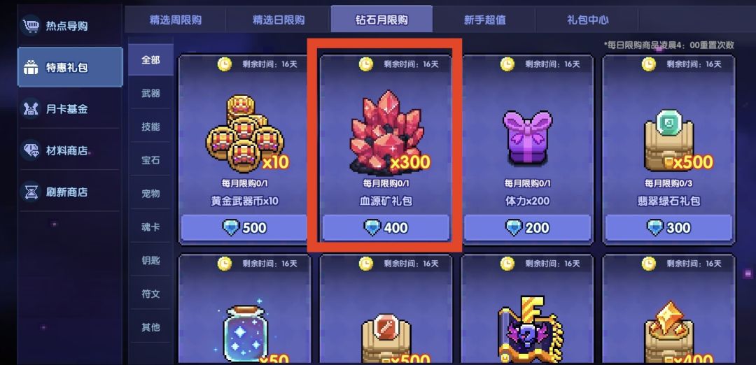 武器升星和强化需要大量“血缘矿”,可以直接购买“钻石月限购”的血缘矿礼包(性价比很高)