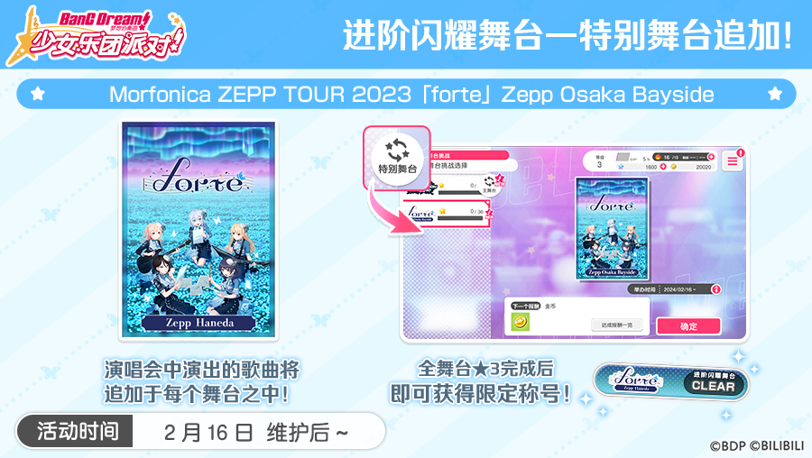 进阶闪耀舞台将于2月16日维护后开启特别舞台Morfonica ZEPP TOUR 2023「forte」@Zepp Osaka Bayside!完成全舞台★3演出,即可获得Morfonica ZEPP TOUR 2023「forte」@Zepp Osaka Bayside开展纪念称号,大家一起来尝试挑战吧~
