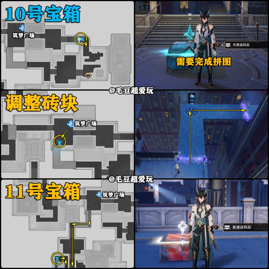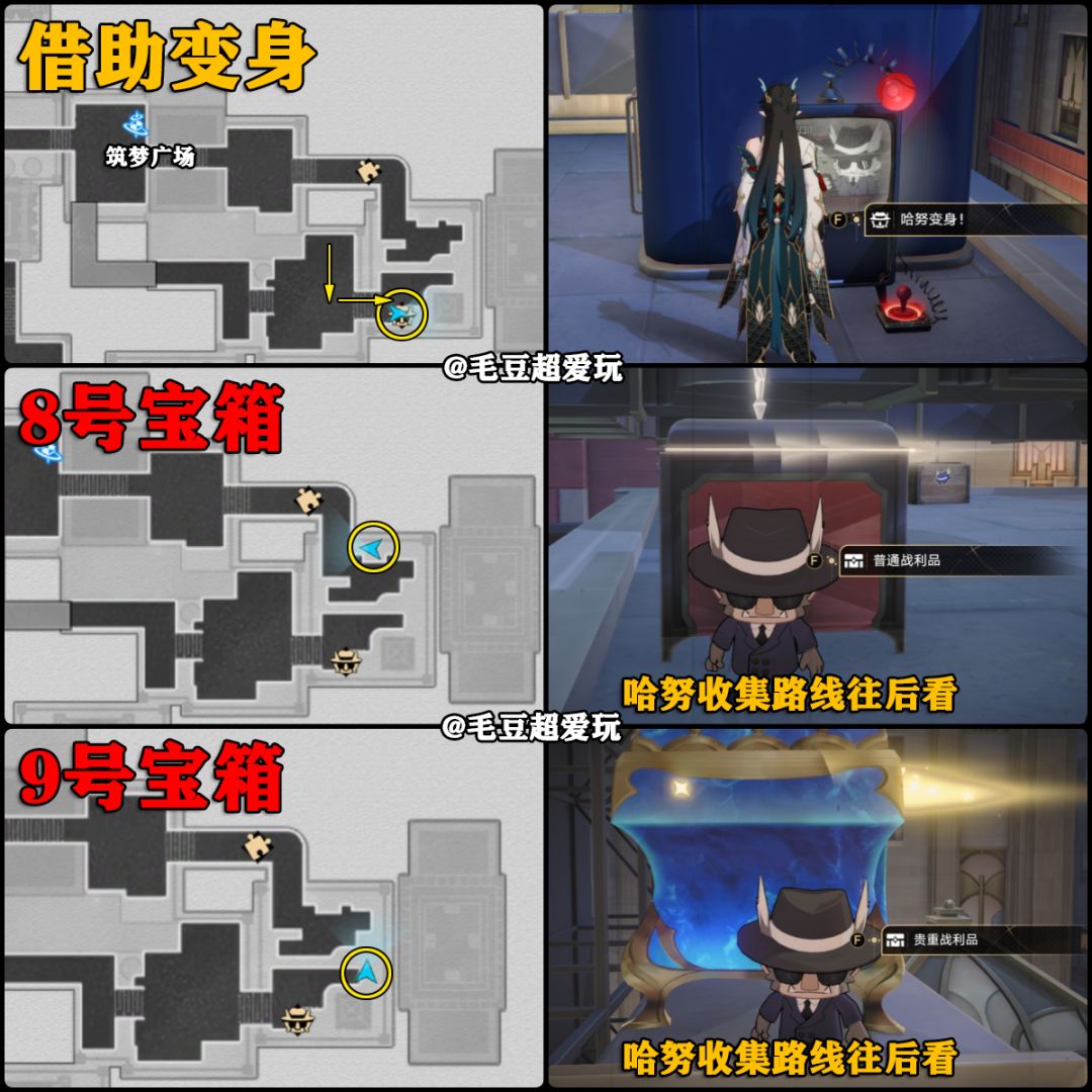 宝箱收集难点在于地砖的调整,8、9号宝箱需要借助哈努行动。