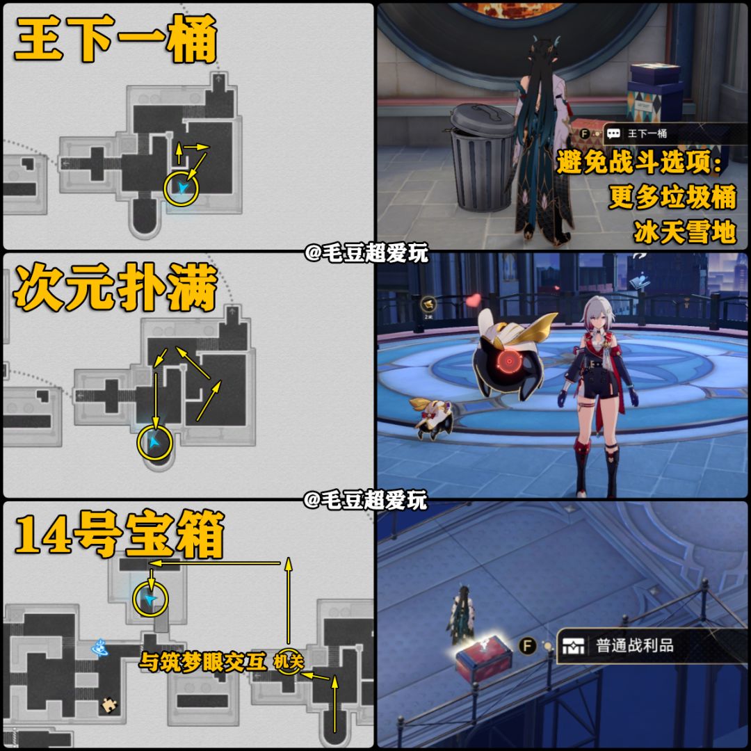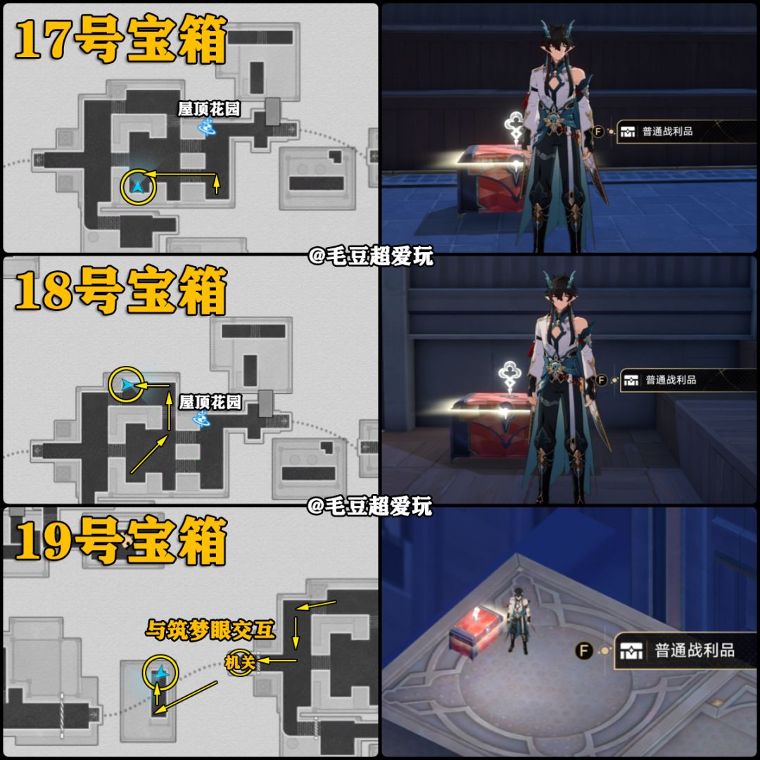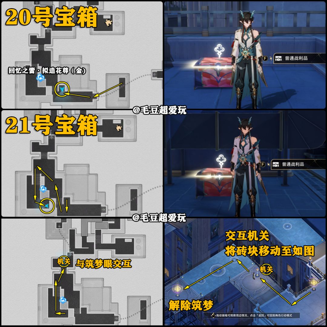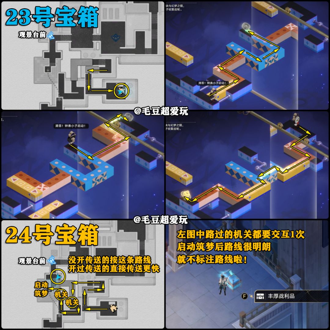 本批宝箱收集的难点依旧是地砖的旋转、机关的交互等,毛豆在地图中标注了机关的位置,防止开拓者们迷路。