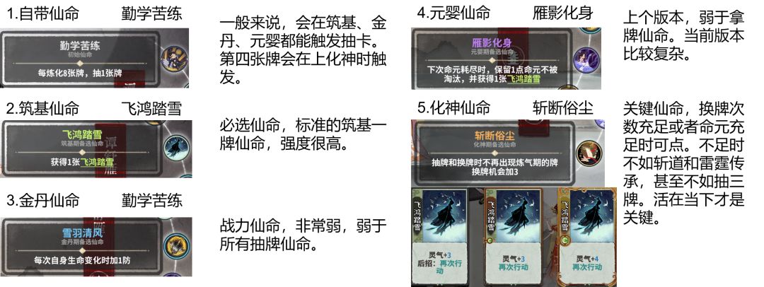 勤学苦练和斩断俗尘这两个仙命可以看出,谭舒雁是偏向大后期的角色,但是由于前期战力的缺乏,如何生存到大后期才是真正的难度。合成恰当的牌也是一种选择。