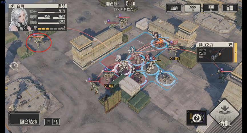 这里由于我的练度不够,只能解掉上回合残留的狙击,如果你练度足够的话,可以把轻甲狙击也收掉,降低T的压力,保证不进入禁援护怪射程即可