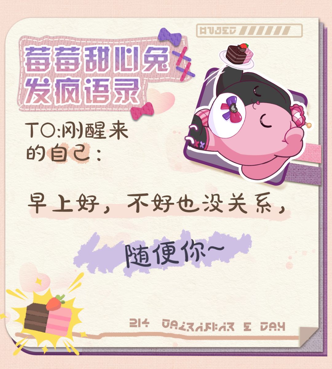 对刚醒来的自己,莓莓甜心兔表示