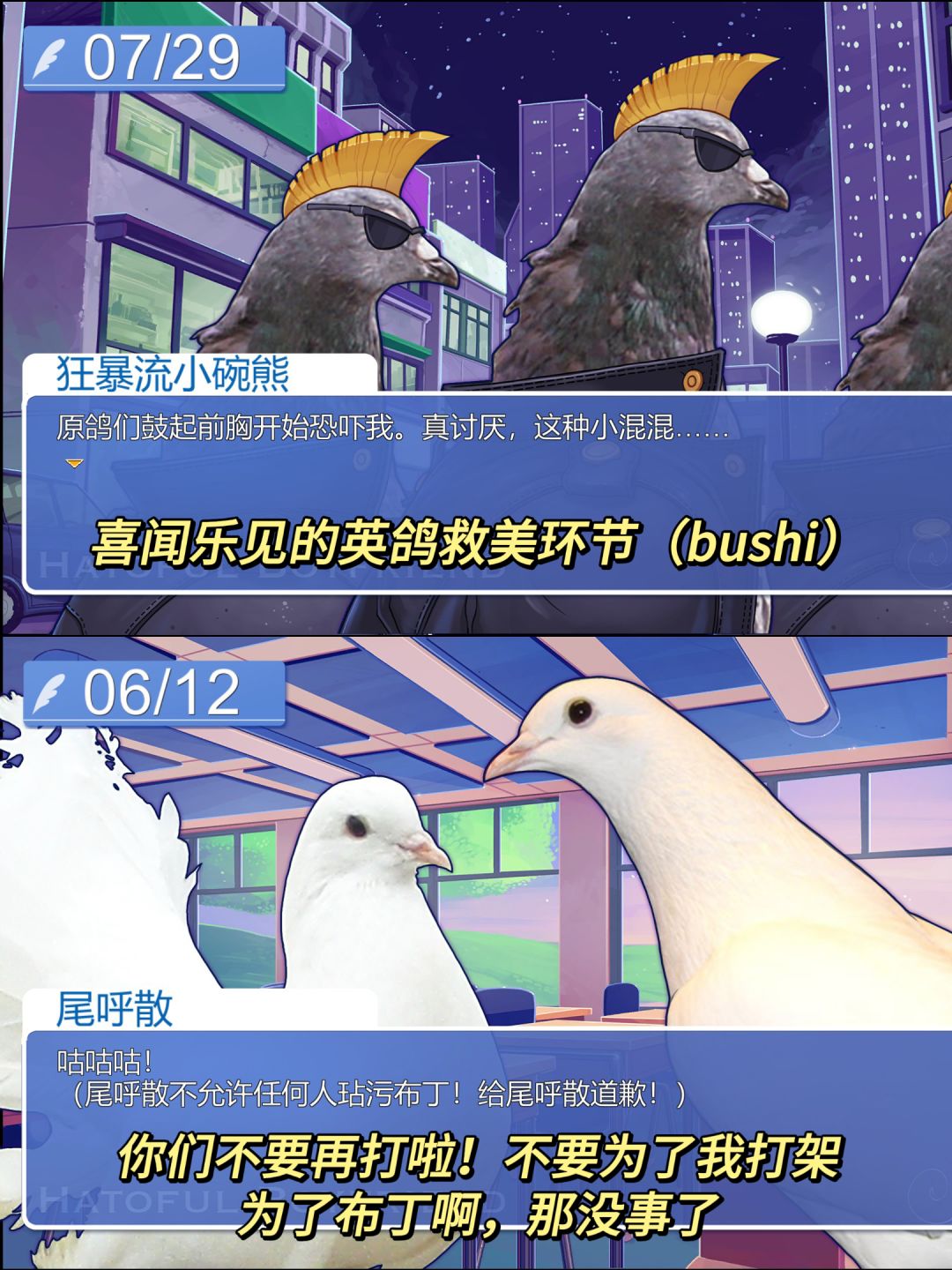 游戏表面是普通的日式校园恋爱游戏,但是对象是一群鸽子🕊️!有霸道总裁鸽、腹黑会长鸽(这俩还是双胞胎兄弟)、迷糊老师鸽、忧郁学长鸽、青梅竹马鸽……把恋爱游戏的属性都放在鸽子身上,产生了一种莫名生草的感觉。