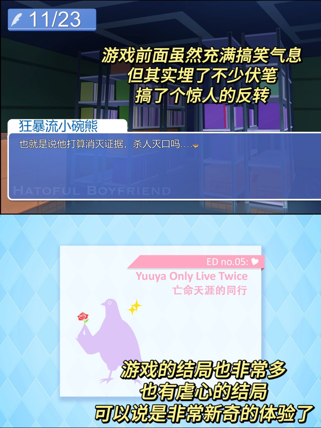 一开始我玩这个游戏基本是带着“我看看你到底要搞什么么蛾子”的戏谑态度,但实际打通所有结局后,还是对这个游戏肃然起敬,游戏的世界观非常完整,设定离谱但很严谨,最后的多结局路线,也让对这群鸽子产生了超高的好感度,毕竟谁不喜欢一群努力救你的鸽子呢?