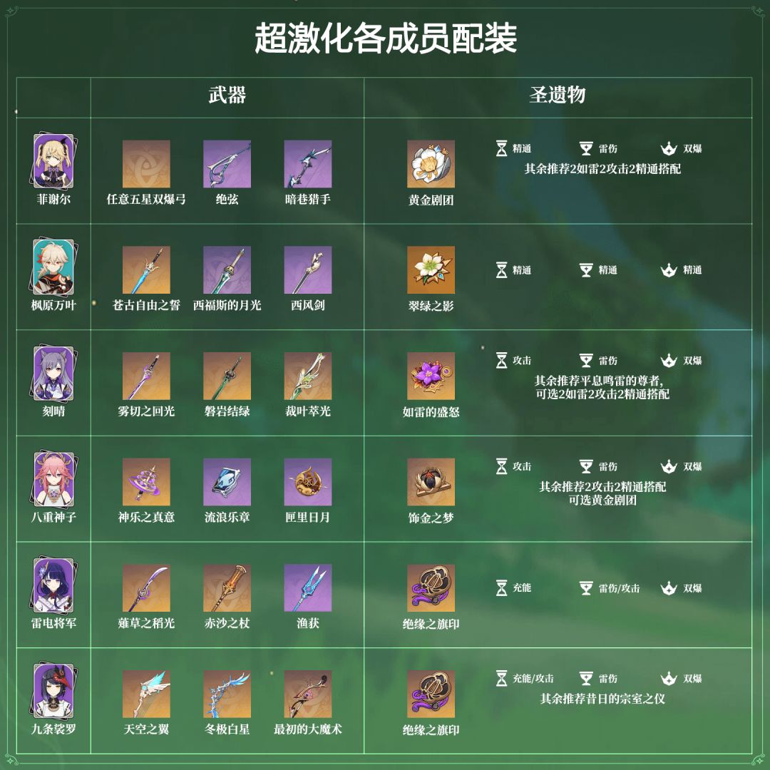 利用激化反应的基础伤害加成提高输出,并且没有绽放。在雷角色前台的激化队伍中,菲谢尔由于高频落雷的独立附着,会成为队伍重要的伤害来源。这种队伍以超激化为主