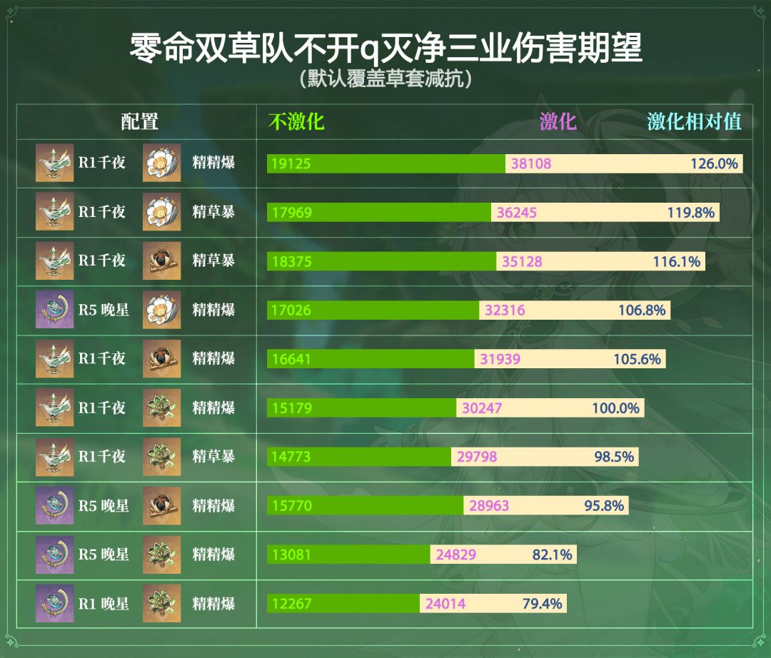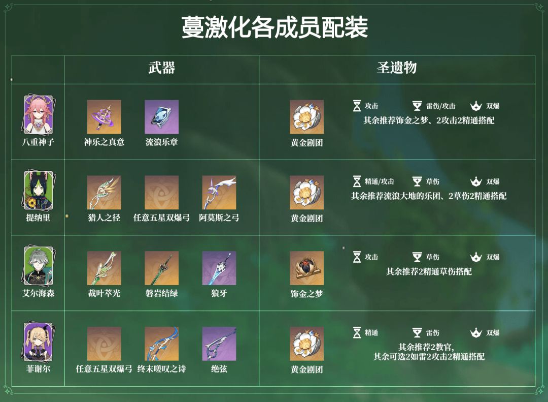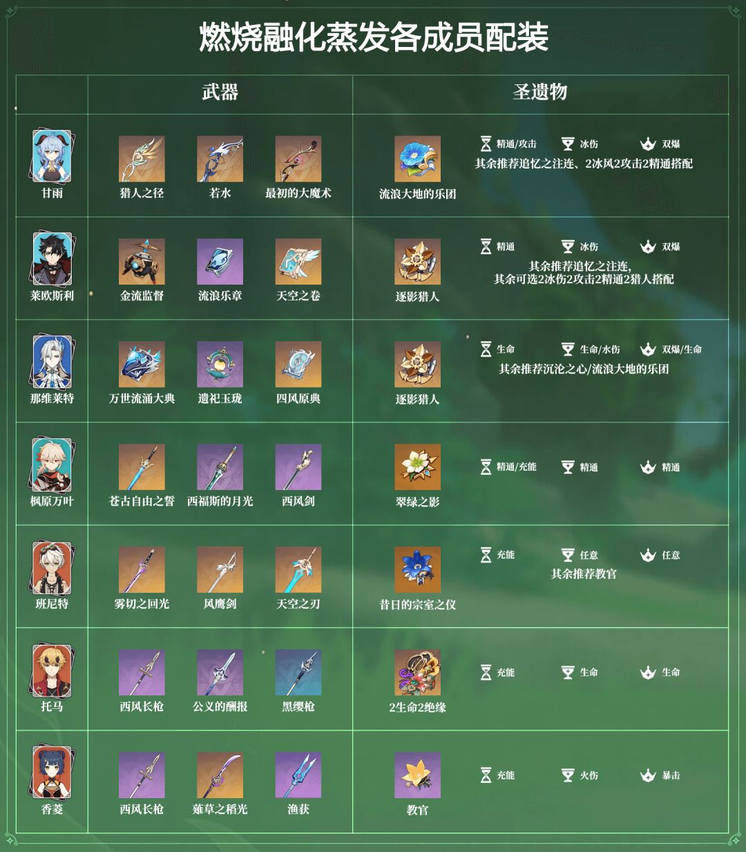 利用燃烧产生的强火支撑融化、蒸发反应(主要是融化)。由于这种队伍草伤占比很低,纳西妲推荐携带辅助相应主C的圣遗物(如辅助甘雨、莱欧时可使用千岩套加攻击力)