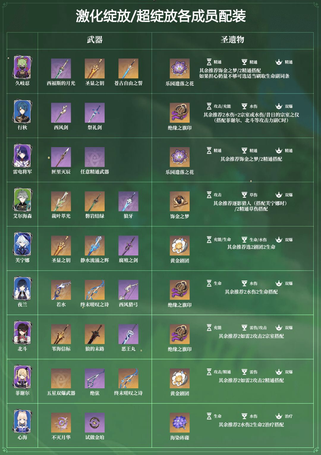 纳西妲作为游戏中强力的挂草角色,在大部分涉及草反应的队伍中都是优选,主要包括:妮露绽放、激绽/超绽、纯激化、燃烧融化蒸发队伍。这里简单介绍其中的代表配队和建议配装。烈绽放目前缺少良好的适配角色与环境,就不做介绍了。