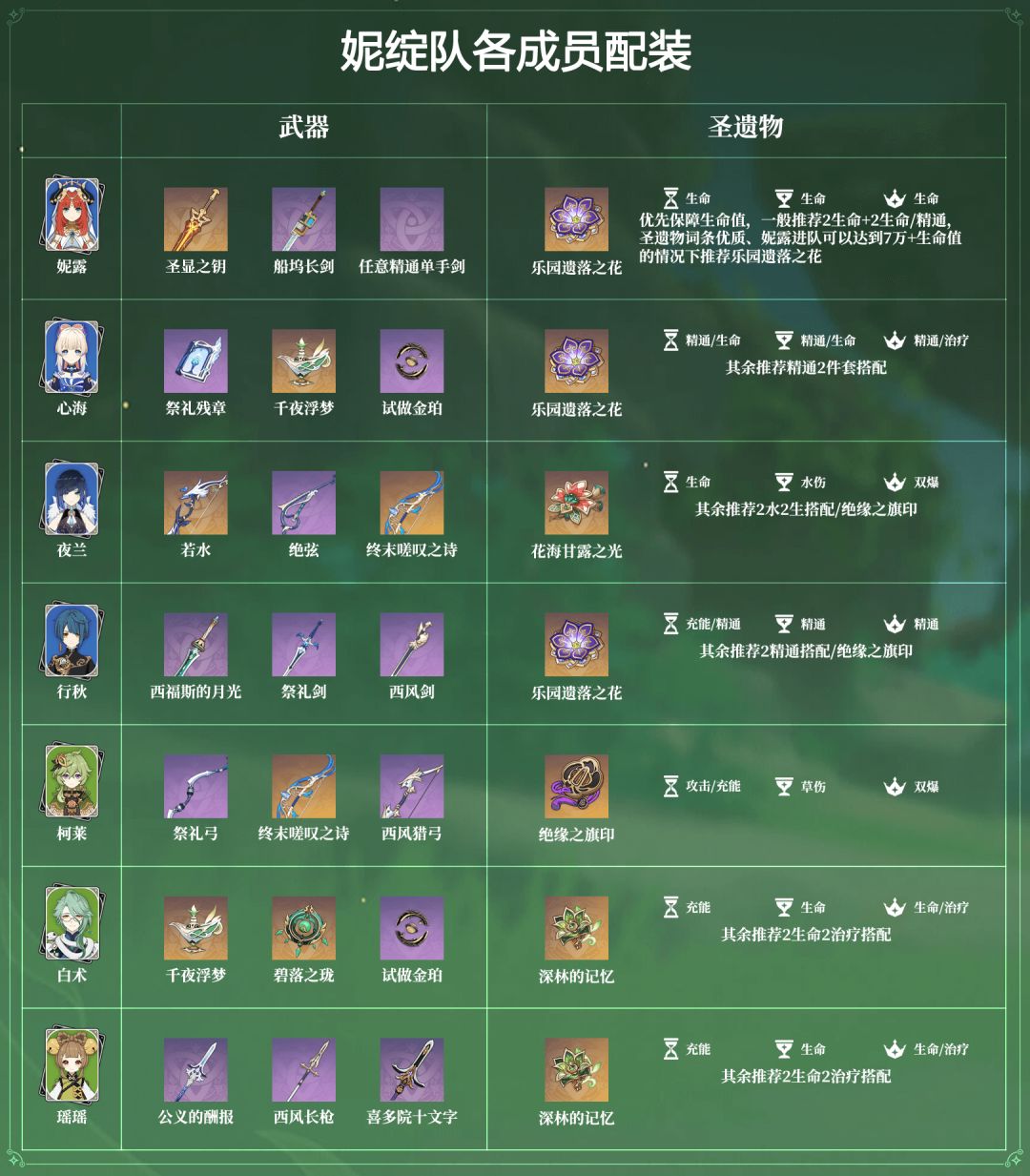 除了纳西妲外,首先保证获取妮露,优先抽取圣显之钥/船坞长剑之一,之后优先获取妮露二命、纳西妲二命。建议在妮露有生命单手剑且夜兰有2命的情况下再考虑使用夜兰进妮绽队