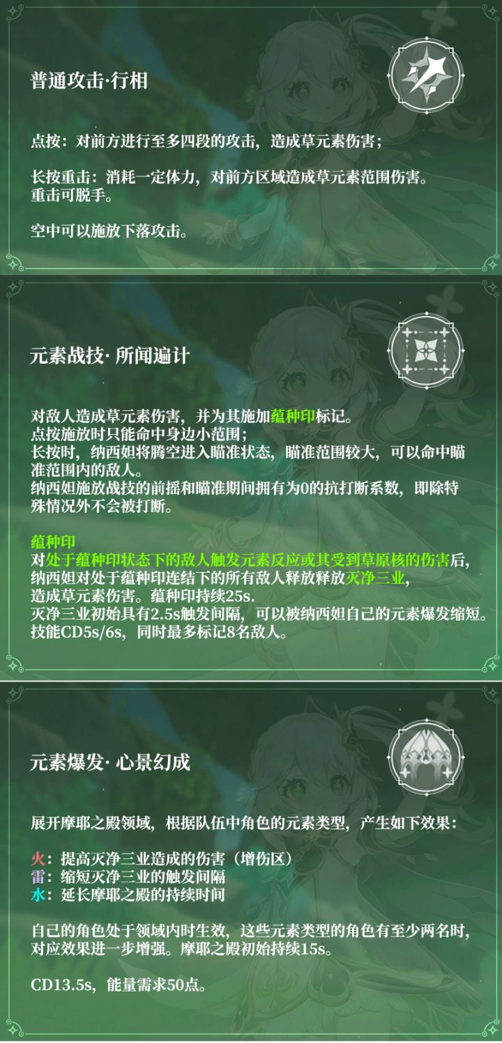 纳西妲元素战技的所有攻击均无附着CD,灭净三业可施加1.5单位元素量(6命效果除外)
