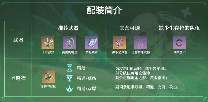 此外,纳西妲的元素战技可以对场上所有敌人施加蕴种印并持续攻击敌人,是适配深林记忆减抗效果的最佳角色,而减抗效果收益很高,在以草伤为主的队伍中是最优选择,如果队伍中有其他角色可以稳定触发深林套减抗,也可以让纳西妲使用饰金/剧团强化自身伤害