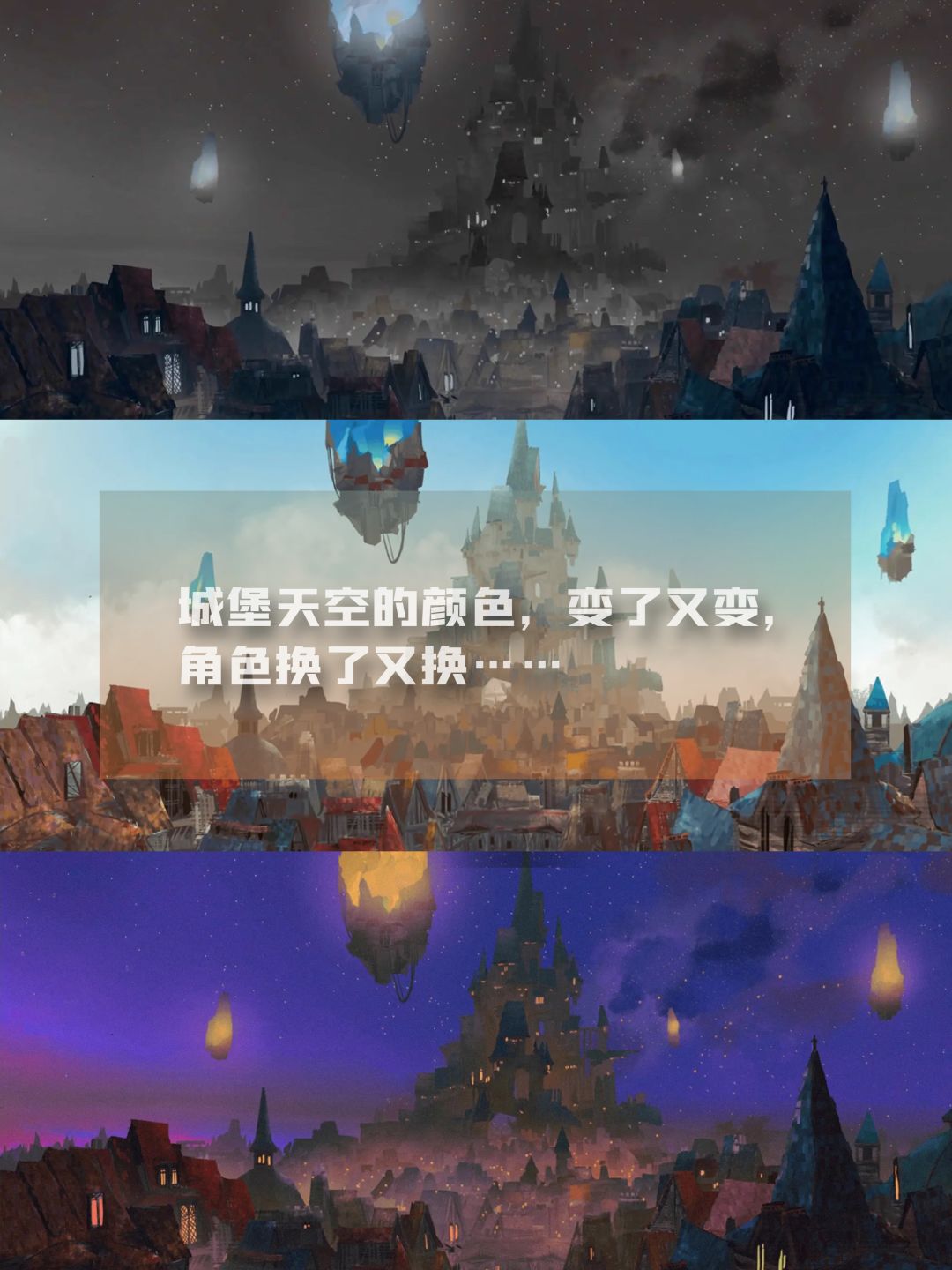城堡的天空随着故事从清晨到夜色渐浓,画面的转变很美,bgm也很应景,你可能会想起曾经某刻的自己…