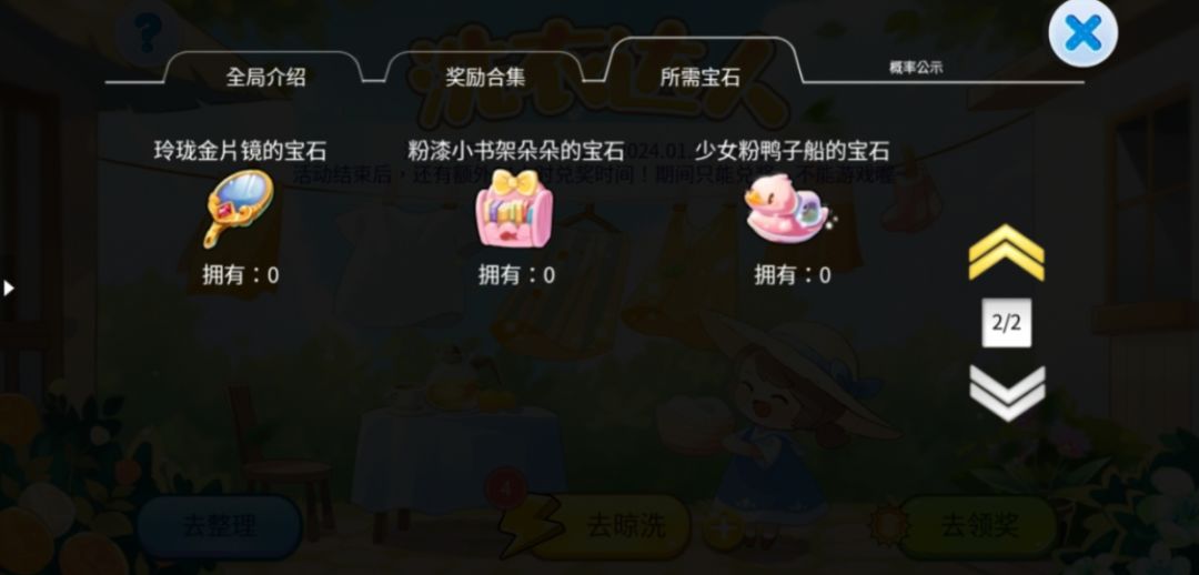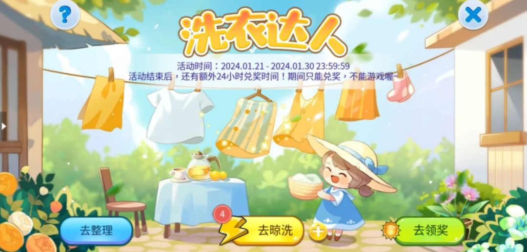 晾晒任务:长按蓄力按钮,在最大力度时释放,帮助小白晾晒更多的袜子。蓄力达到最大值还可以开启福袋并累计进度,可以领取进度奖励。