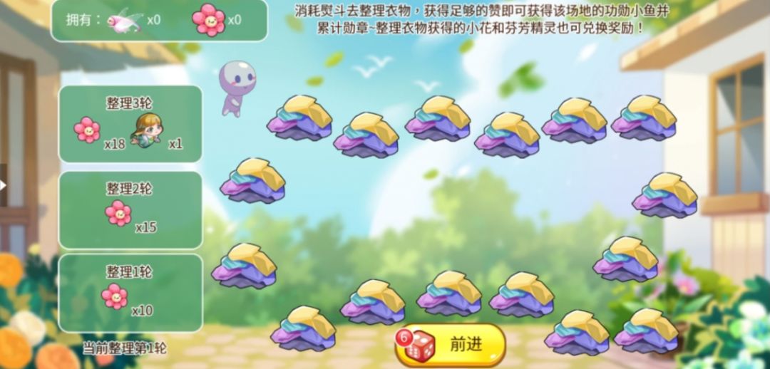 衣物整理总共有3轮,每一轮都设置了奖励。点击投掷骰子,小白会根据投掷出的点数前进对应的步数,前进的路上有机会获得小花和赞哦。